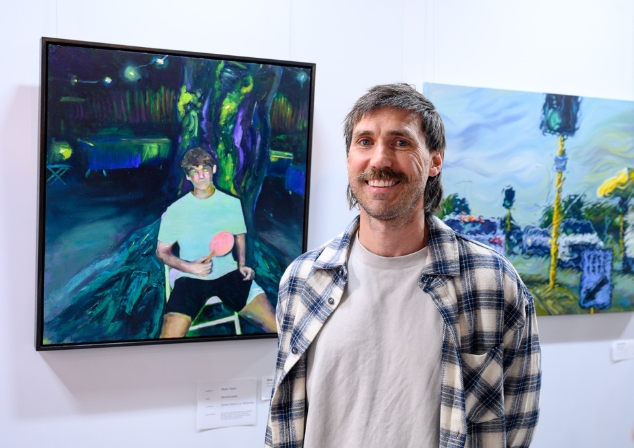 Image: Wade Taylor with his artwork 'Same Clothes as Yesterday' - second prize winner in the 2023 Melville Art Awards, photograph by Miles Noel Studio